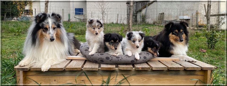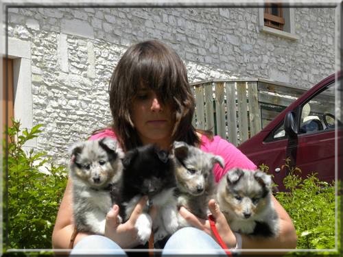 1 femelle bleue merle, 2 males tricolores et 2 femelles tricolores.