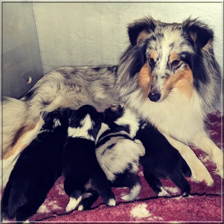 Nous somme heureux de vous annoncer la naissance de 2 femelles bleu-merle et 2 mâles tricolores.